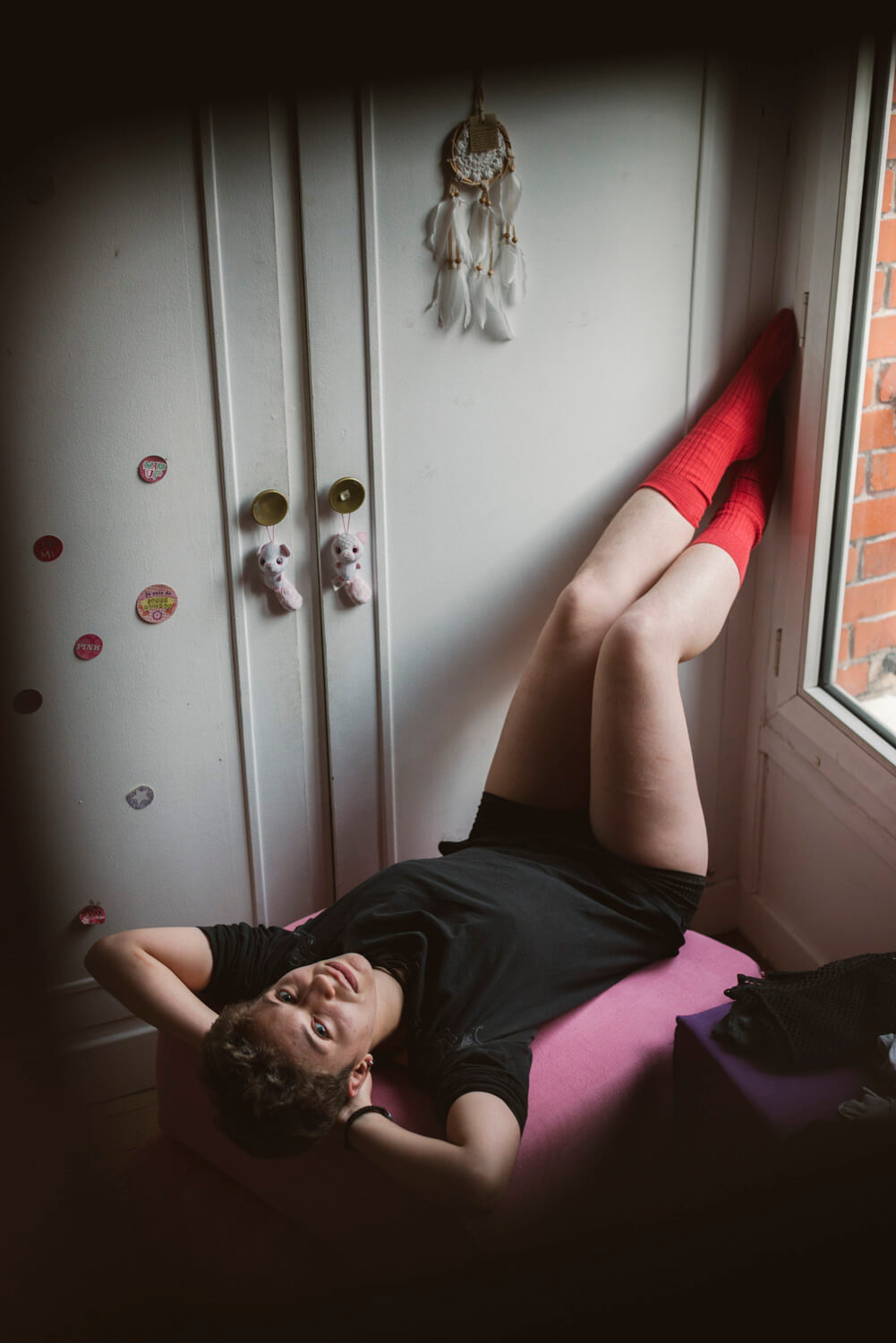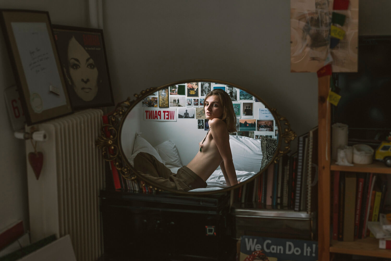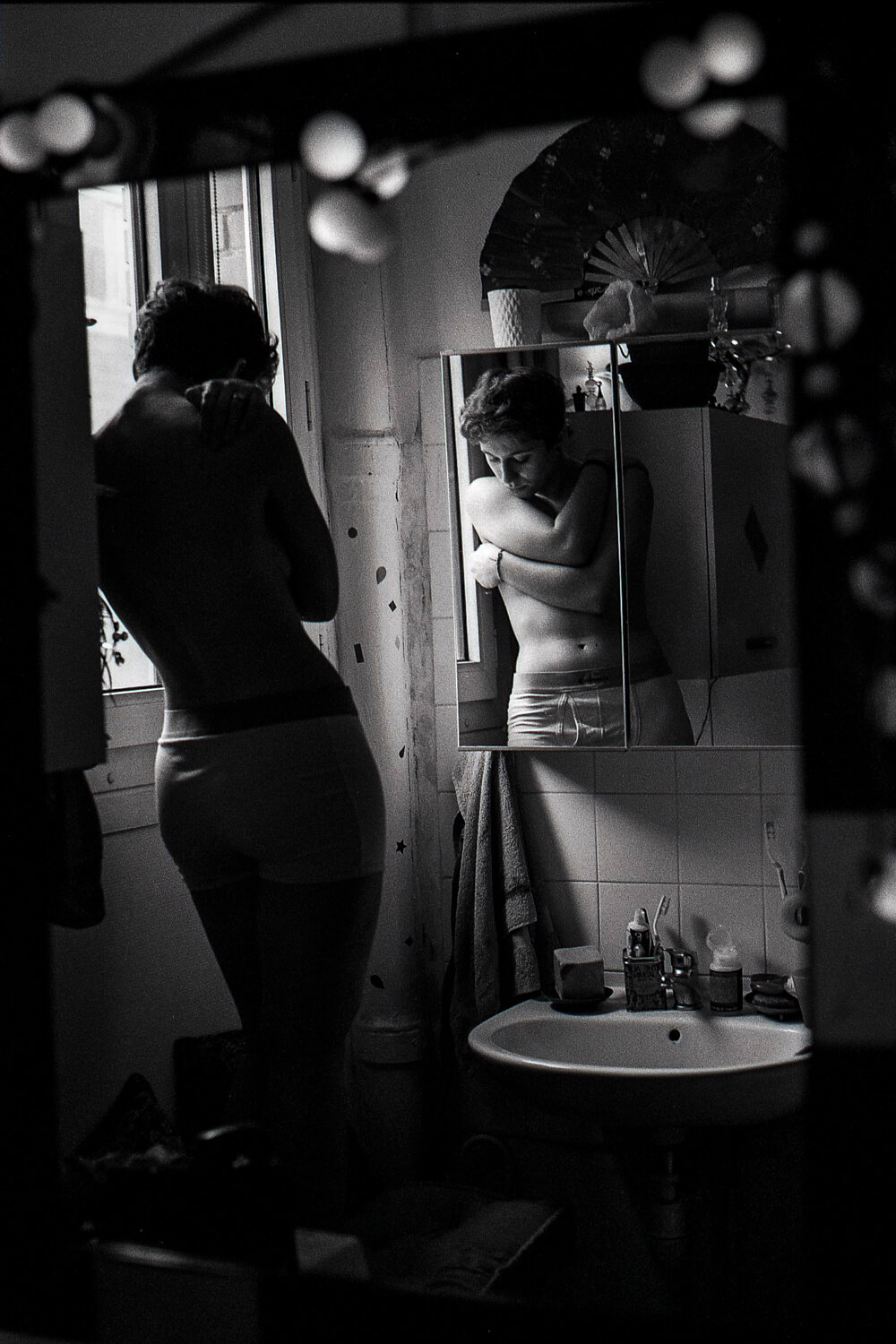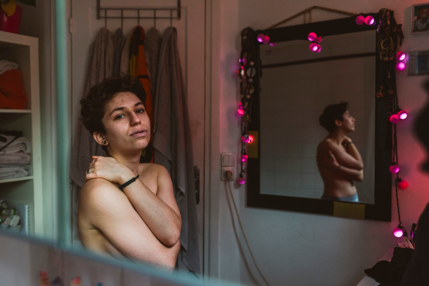 I made an open call on my Instagram account asking for people who might have important difficulties accepting their bodies. The photos were taken in the person's apartments, to get a sense of their intimate space, which is related to who they are. With each one I did several sessions over a period of one year, moving at the pace she decided, to create an intimacy and trust. I incorporated a mirror as an element that has two functions: The aesthetic and the psychological that it can give to the person when looking at itself.